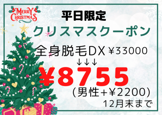 平日限定 全身脱毛DX(顔・VIO込み)¥33000が 破格の!!! ↓↓↓ ☆¥8755☆ (男性+¥2200) で出来ちゃいますよ!