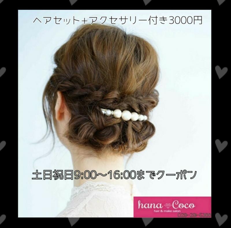 土日祝日は通常2800円のヘアセットに、 選べるアクセサリーが付いてたったの3000円! とてもお得なアクセクーポンをぜひご利用下さい(*´ω`*)