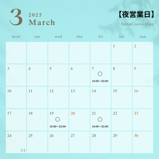 あっという間に2月も終わり、3月!夜営業のスケジュールです♪埋まりやすくなっておりますのでお早めに!